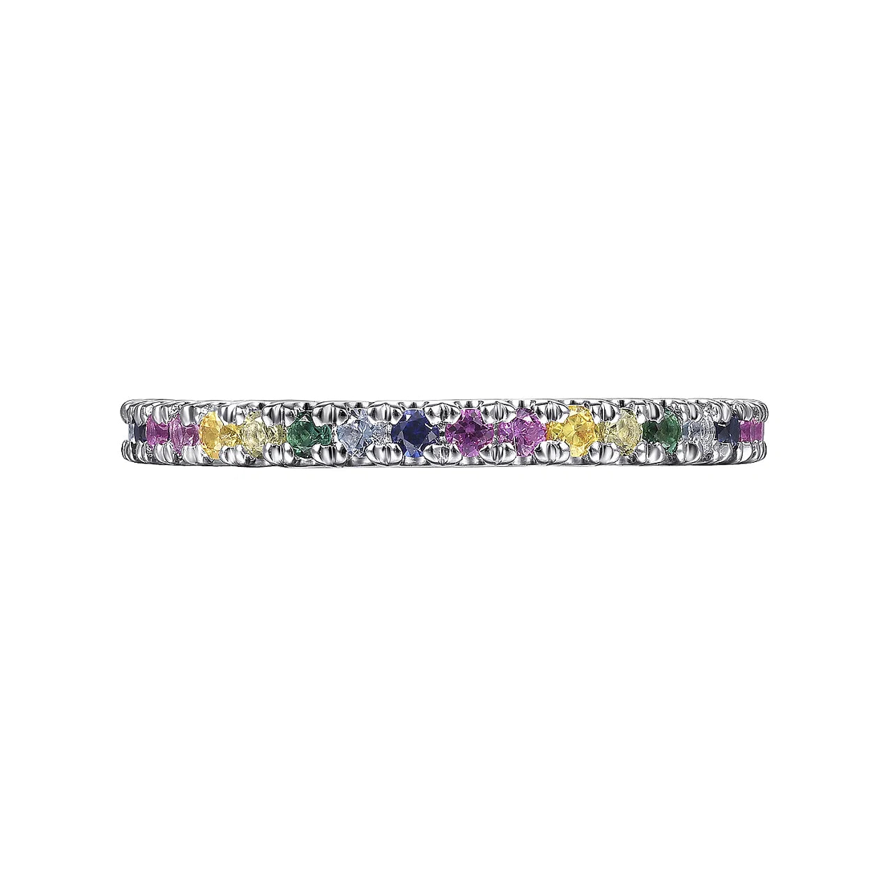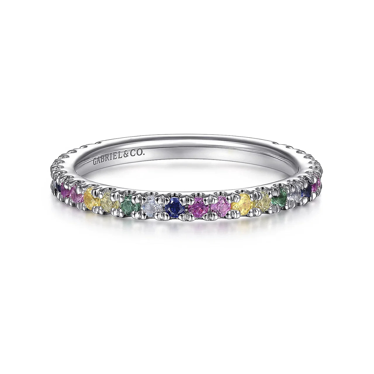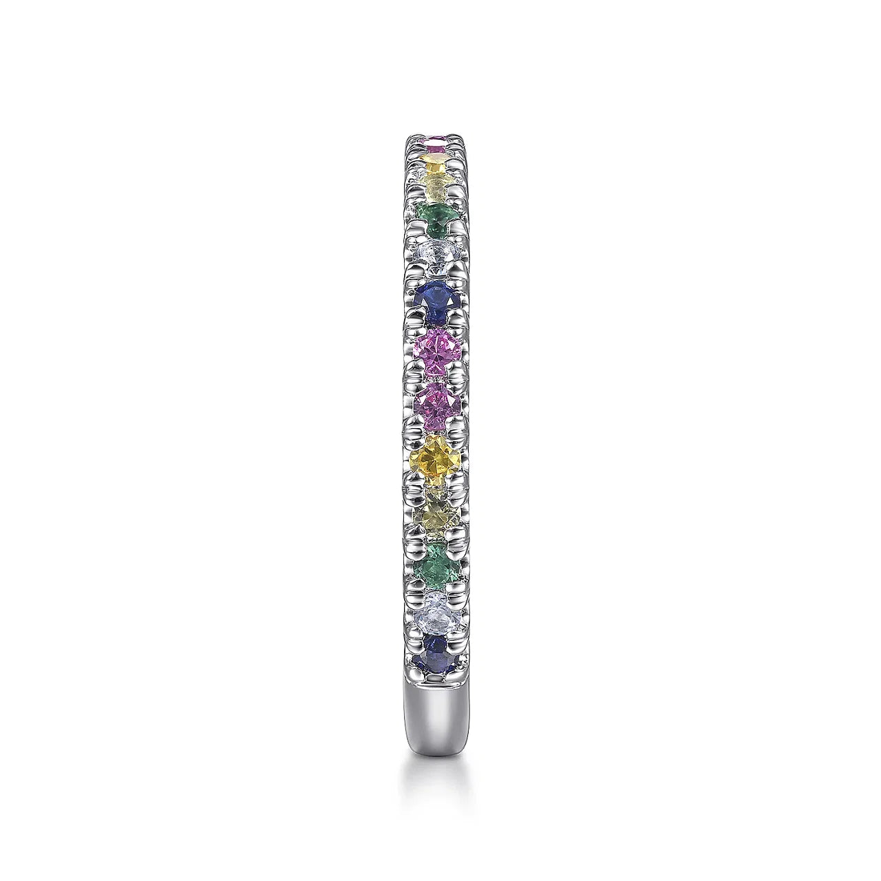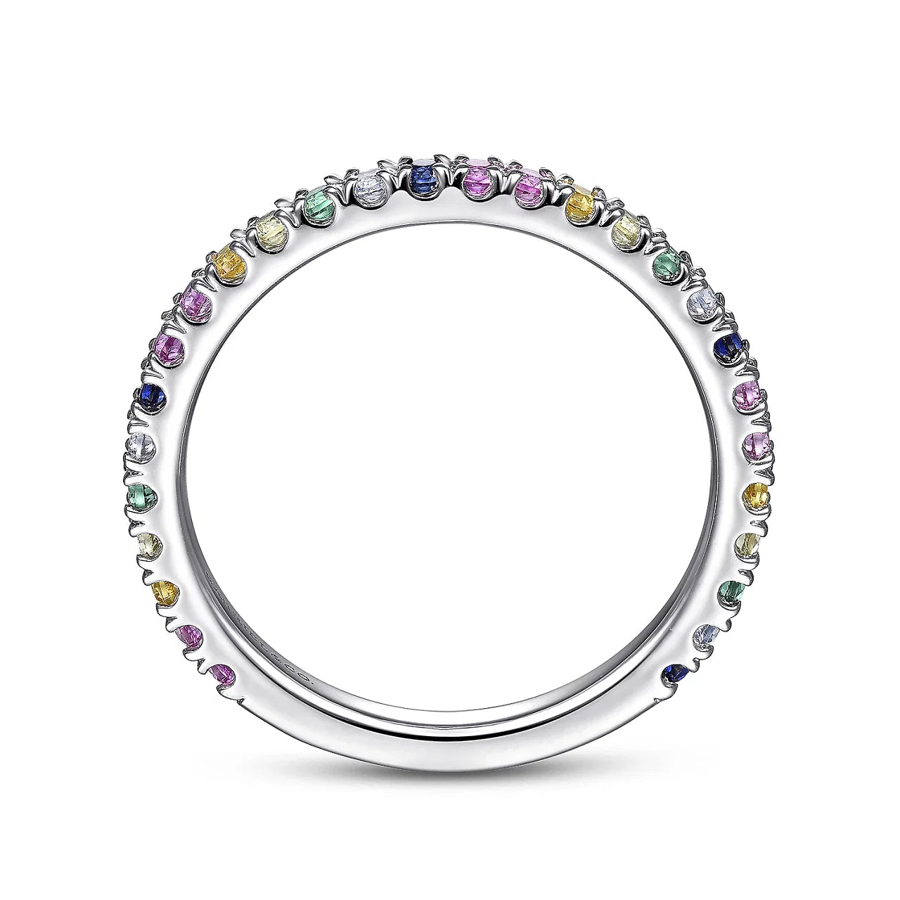 A timeless stackable ring with a sleek straight silhouette and dozens of vivid gemstones. Dainty round sapphire, blue topaz, emerald, peridot, yellow sapphire, ruby and pink tourmaline stones are pavé set throughout the band. Crafted from luxe 14K white gold, this multicolored ring effuses any ensemble with a rainbow of can't miss colors.